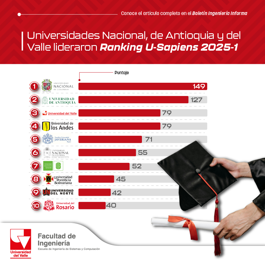 La Universidad del Valle ocupo el tercer lugar en el raking U-Sapiens 2025-1 a nivel nacional. Lea la nota completa aquí en el boletín de ingeniería informa: Enlace vinculado